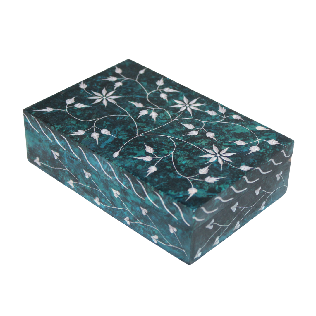 Bring a sense of organic beauty and handcrafted artistry to your space with the Botanical Garden Soapstone Storage Box. Lovingly carved from natural soapstone, this generously sized box (approx. 6" x 4") showcases a winding floral vine motif across the top and all four sides — etched with striking detail by skilled artisans. Available in classic black or a marbled forest blue, this box exudes natural elegance and earthy sophistication.